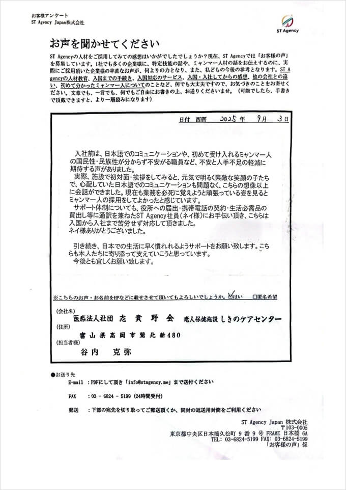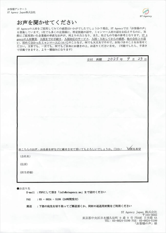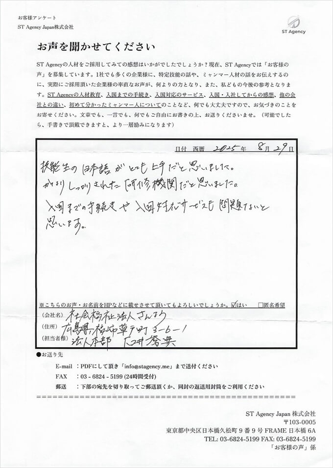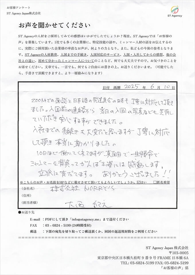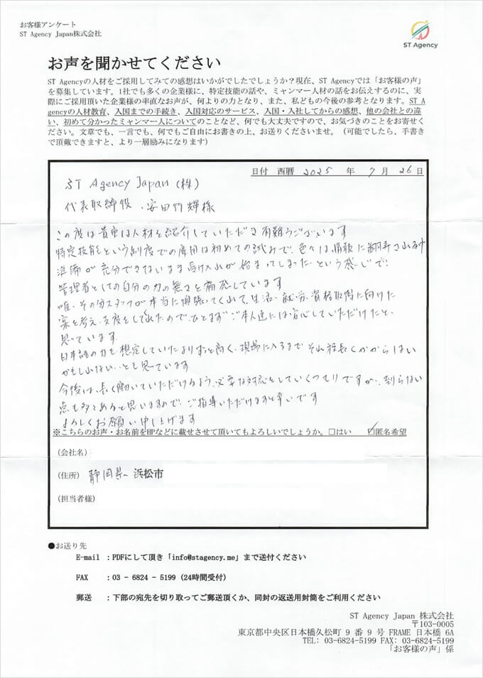 ST Agency Groupでは、自社のミャンマー人ネットワークを活用して、日本在住の特定技能人材の紹介も可能です。